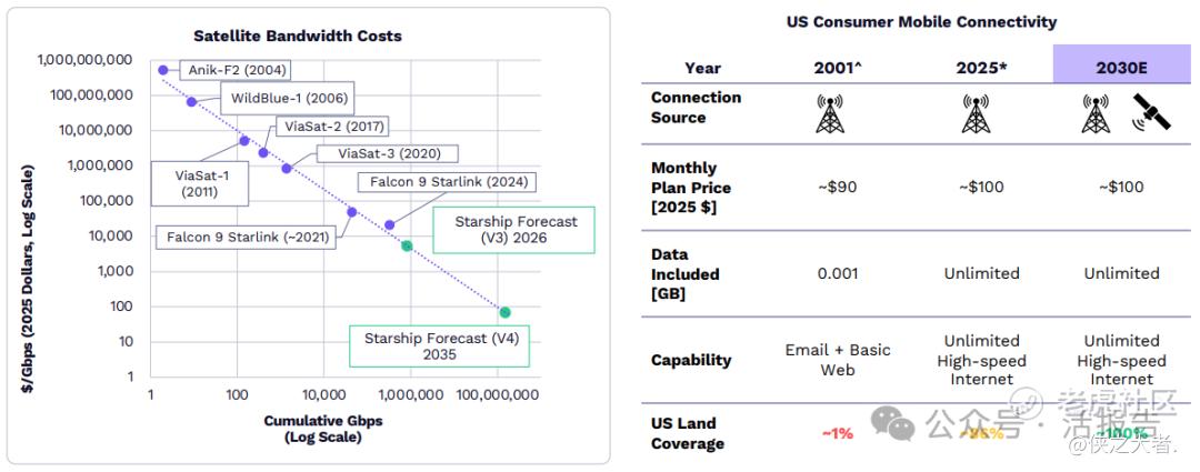 卫星带宽成本也在持续下降,根据莱特定律,每累计轨道千兆比特每秒(Gbps)翻倍,卫星带宽成本下降约44%,这使卫星连接能够补充蜂窝塔,在美国全境提供无处不在的移动覆盖。