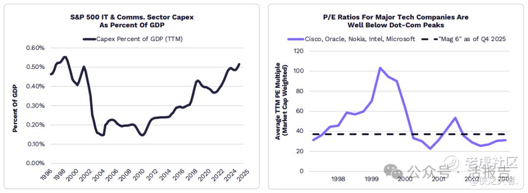 根据ARK的研究,超大规模数据中心运营商在2026年的资本支出(Capex)将超过5000亿美元,达到2021年1350亿美元的三倍。尽管信息技术和通信服务行业的资本支出占GDP的比例已达到1998年以来的最高水平,但科技行业的估值却低得多,PE仅为科技和电信泡沫时期峰值的一小部分。