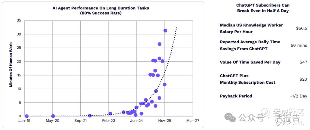 AI Agents正在变得越来越熟练。推理能力、工具使用和扩展上下文的进步正推动人工智能代理的能力呈指数级增长。到2025年,它们能够可靠完成任务的时间将增加5倍,从6分钟增加到31分钟。