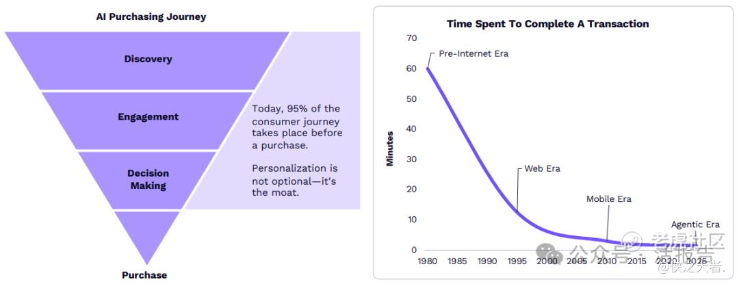 AI模型正在融合为一个消费者操作系统,消费者接受人工智能的速度远超互联网的普及速度。并且,AI采购代理正在以前所未有的个性化和速度缩短购买流程,提高消费者交易速度。