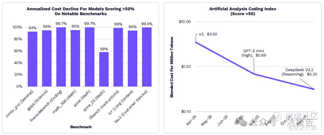 而在大多数领域,AI模型的成本正以指数级速度下降。2025年4月至12月的八个月间,软件开发成本下降了91%,从每百万token 3.50美元降至0.32美元。