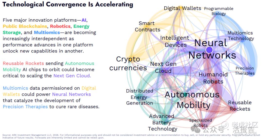 2026年,ARK基金重点聚焦13大创新领域,预测以人工智能为中枢的五大创新平台正在加速融合,并引发全球经济增长的阶跃式变化。以下为**整理的《ARK Big Ideas 2026》的核心内容: