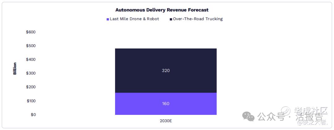 ARK研究表明,全球自动配送收入到2030年可能达到4800亿美元,监管和后端装载作业的自动化将是重要的制约因素。