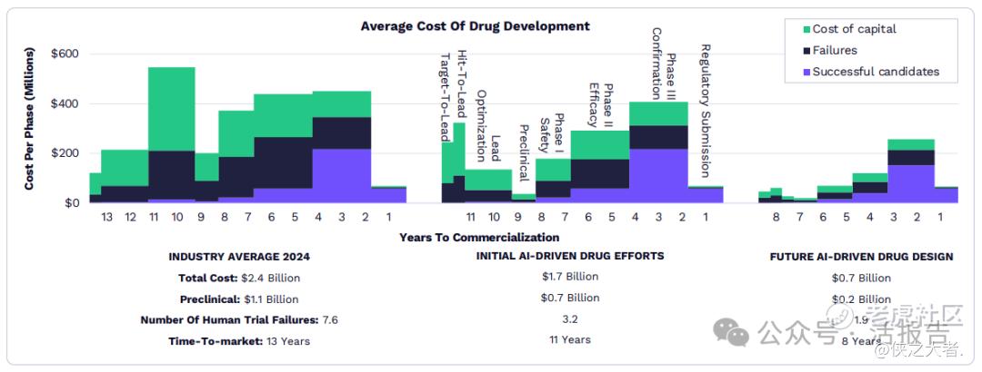 AI正在改变药物研发的经济格局。AI驱动的药物研发可以将药物上市时间缩短约40%,从13年缩短至8年,同时将药物总成本降低约4倍,从目前的24亿美元降至7亿美元。