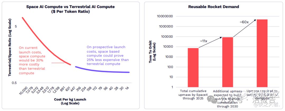 此外,技术融合将推动需求大幅增长。下一代云计算对神经网络的需求正面临地球规模的限制,而可重复使用的火箭或许能解决这一难题。太空AI计算成本低廉,却能为云计算提供神经网络持续增长所需的计算能力。AI芯片的增长或使可重复使用火箭的需求量比现有模式增长60倍。