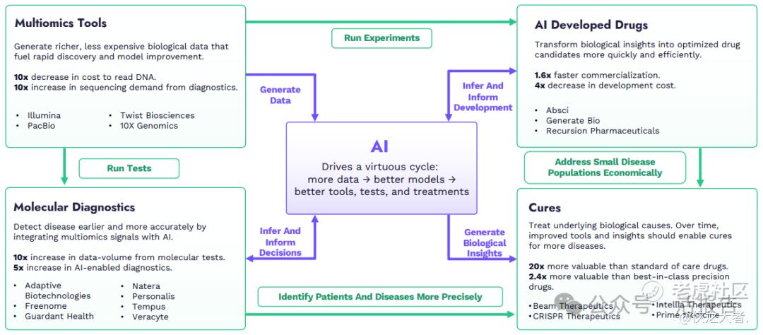 其中,多组学工具将生成更丰富、更经济的生物学数据,以促进快速发现和模型改进;AI药物开发能够更快、更高效地将生物学见解转化为优化的候选药物;分子诊断则通过将多组学信号与AI相结合,更早、更准确地检测疾病;AI产生更好的生物学洞察能够治愈更多疾病。
