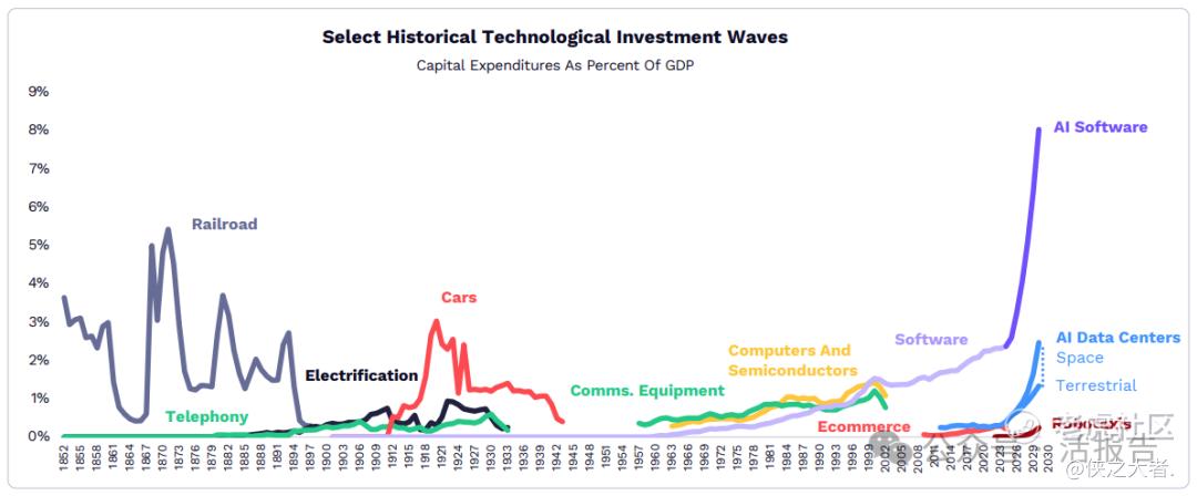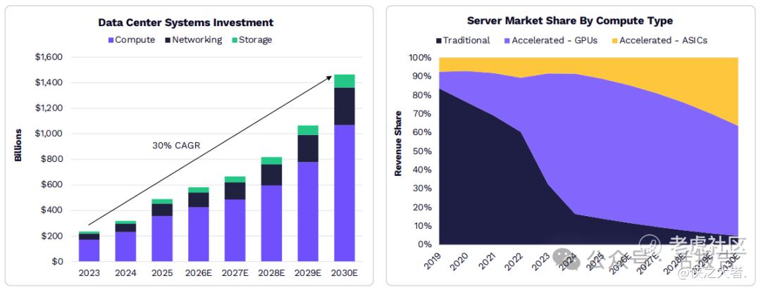 随着AI工作负载在企业和消费者环境中的激增,到2030年,AI基础设施投资可能超过1.4万亿美元,其中大部分将用于加速服务器。ARK的研究表明,随着AI实验室和超大规模数据中心寻求经济高效的计算,博通和亚马逊旗下Annapurna Labs等公司设计的ASIC将继续占据市场份额。