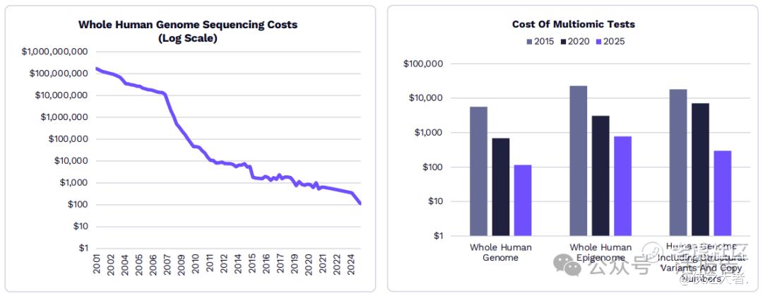 与此同时,生成多组学数据的成本已急剧下降。到2030年,对整个人类基因组进行测序的成本可能会下降近十倍,降至10美元。