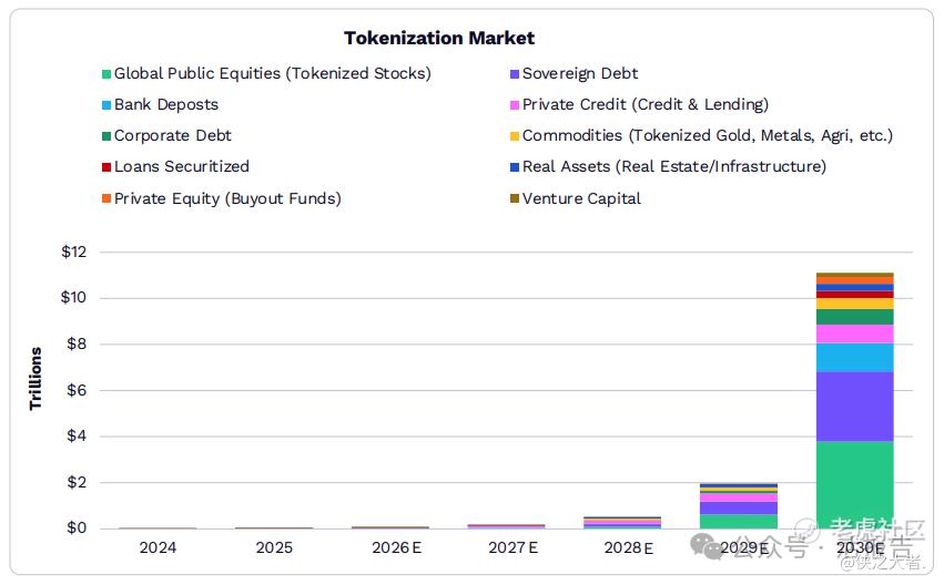 到2030年,全球代币化资产市场规模可能超过11万亿美元,约占所有金融资产的1.38%。虽然主权债目前在代币化领域占据主导地位,但ARK预计未来五年内银行存款和全球公共股权价值的链上占比将比现在更大。