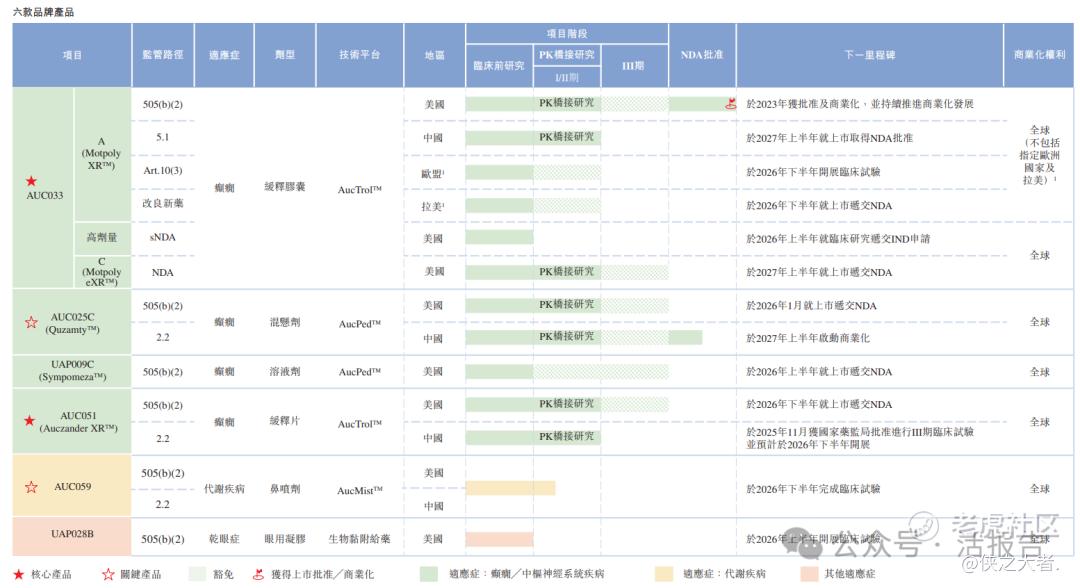 值得注意的是,公司已向合作伙伴A(一家独立且领先的全球特种制药公司,总部位于西班牙)授予AUC033A的独家权利,以在欧洲及拉丁美洲的指定国家将AUC033A商业化;合作伙伴A获授、持有并维持上市许可,期限为自各个国家上市日期起计12年。截至最后实际可行日期,AUC033A尚未在该等国家上市。