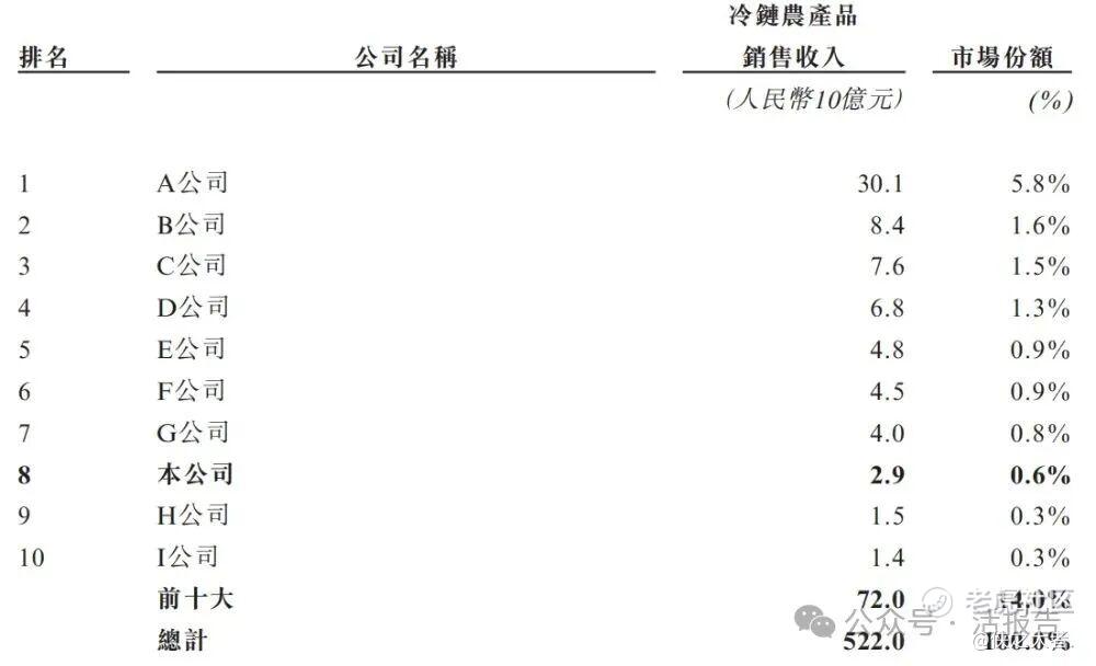 根据弗若斯特沙利文的资料,按2024年的冷链农产品销售收入计,公司在中国数智化冷链农产品销售市场中排名前十。截至最后实际可行日期,公司的冷链数智综合解决方案已获超过750家国内冷链运营商配置,包括农产品批发市场、食品加工厂、农产品产业园及主要农产品进口口岸,覆盖中国约30个省、自治区及直辖市。