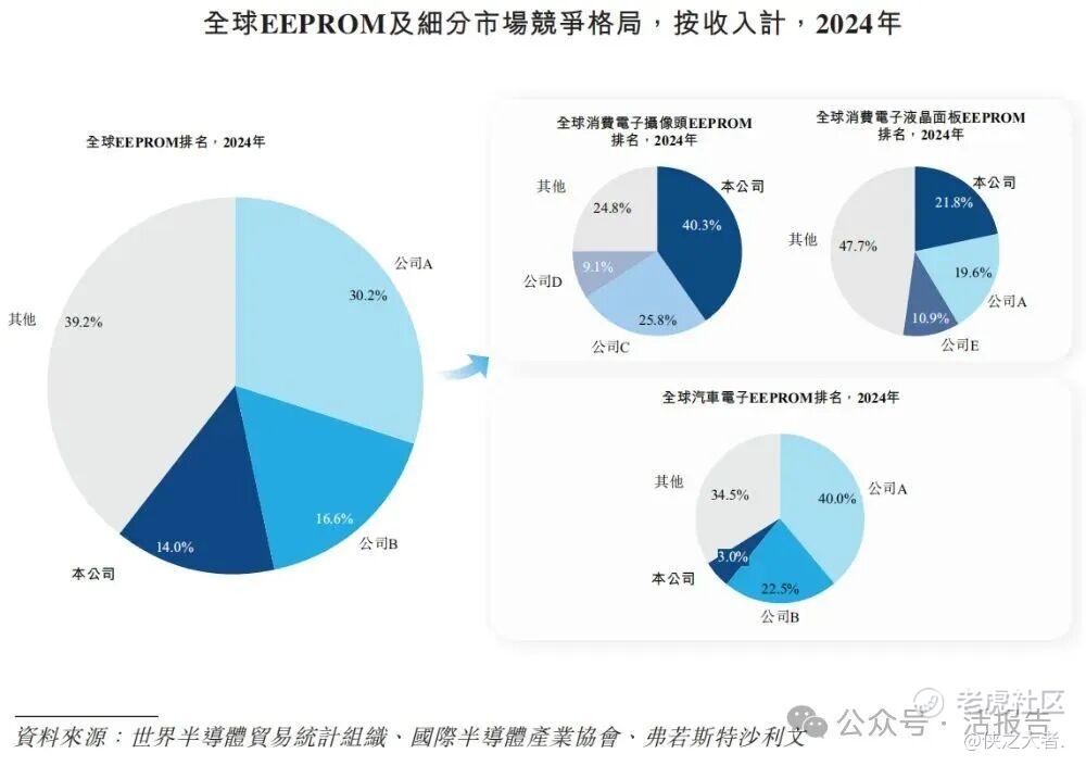 按2024年收入计,在全球EEPROM市场,公司是全球排名第三的EEPROM供应商和最大的EEPROM中国供应商。在消费电子EEPROM板块,公司在消费电子摄像头模块EEPROM及消费电子液晶面板EEPROM市场亦分别以40.3%和21.8%的份额排名全球第一。
