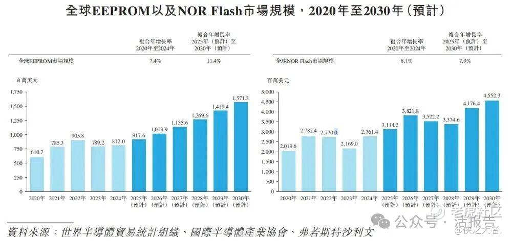 根据弗若斯特沙利文(Frost & Sullivan)的报告,EEPROM芯片市场规模从2020年的610.7百万美元增长至2024年的812.0百万美元,复合年增长率为7.4%。NOR Flash芯片市场规模从2020年的2,019.6百万美元增长至2024年的2,761.4百万美元,复合年增长率为8.1%。