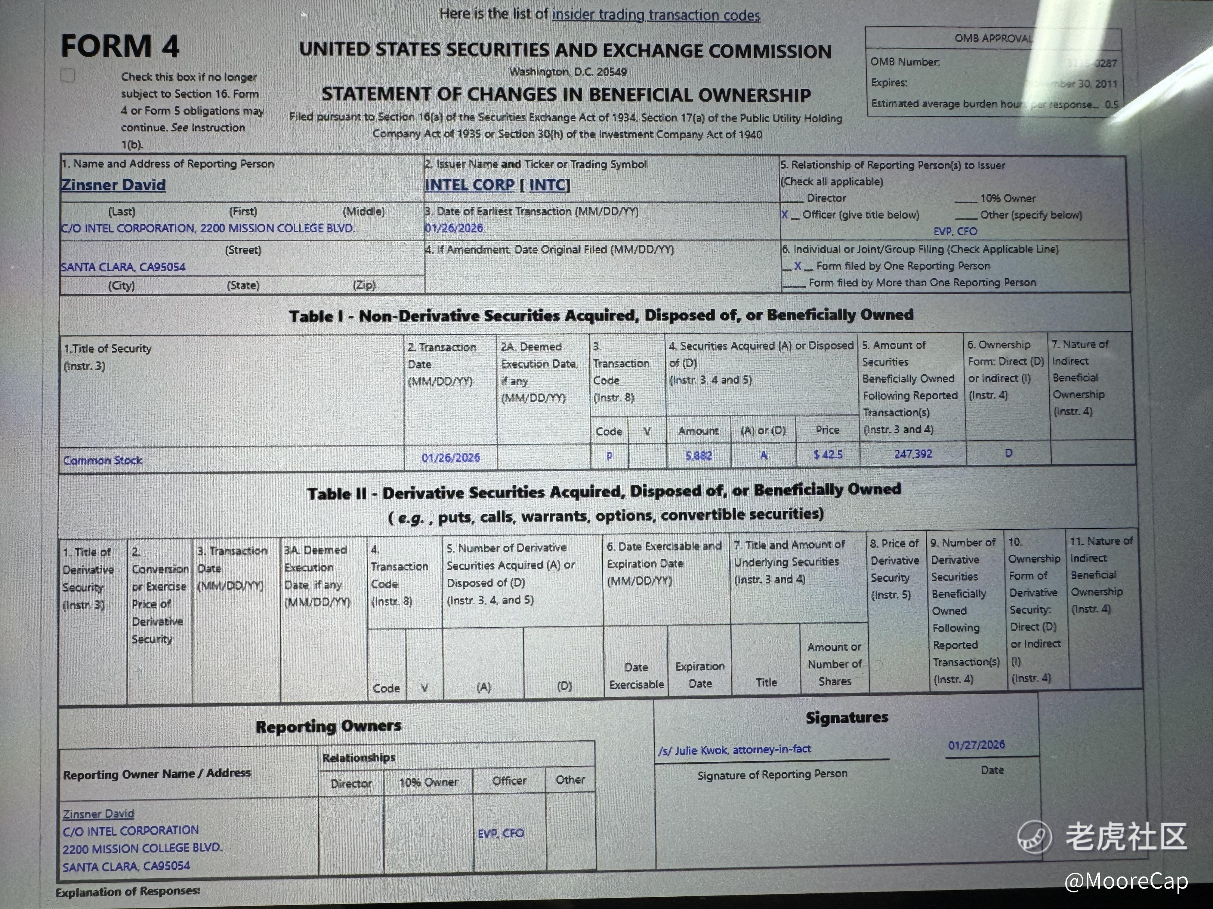 Intel首席财务官刚刚以25万美元的价格买了5882股股票。平均价格42美元。这是非常积极的信号。