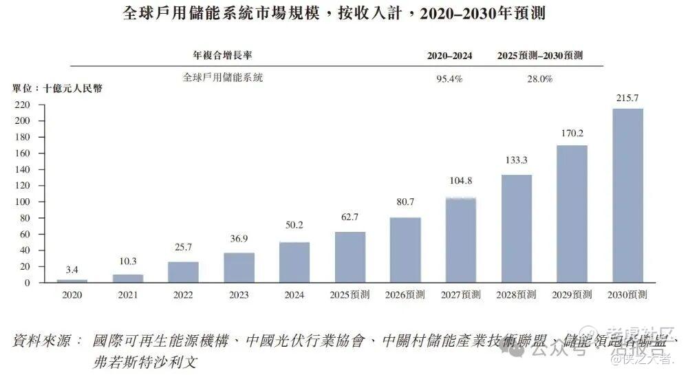 根据弗若斯特沙利文(Frost & Sullivan)的报告,全球户用储能系统市场的市场规模由2020年的34亿元人民币增至2024年的502亿元人民币,复合年增长率达95.4%。预计市场规模将持续扩大,从2025年的627亿元人民币增长至2030年的2,157亿元人民币,对应复合年增长率为28.0%。