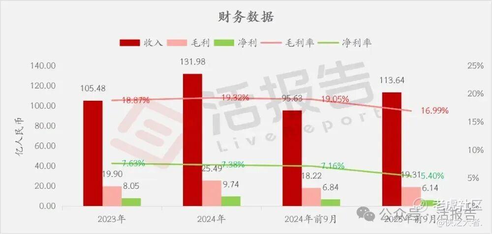 公司是汽车饰件系统解决方案提供商,2024年收入131.98亿元,净利润9.74亿元,毛利率19.32%。2025年前9月收入113.64亿元,净利润6.14亿元,毛利率16.99%。2025年前三季度收入增长利润下滑。