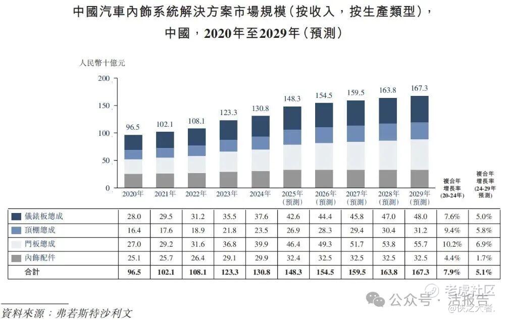 根据弗若斯特沙利文(Frost & Sullivan)的报告,中国汽车内饰系统市场经历快速增长,从2020年的人民币965亿元增至2024年的人民币1,308亿元,2020年至2024年的复合年增长率为7.9%;预计在未来将进一步扩张,至2029年达到人民币1,673亿元,2024年至2029年的复合年增长率为5.1%。