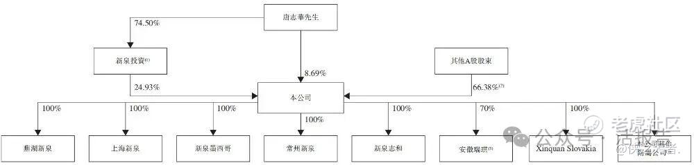 公司由新泉投资直接持股24.93%,而新泉投资由唐志华先生拥有及控制;及由唐志华先生直接持股8.69%。唐志华先生及新泉投资构成公司的一组控股股东。