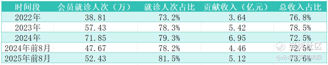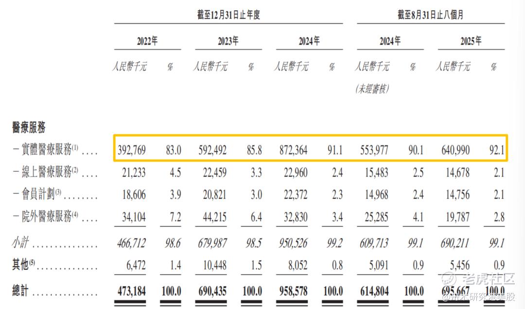 实体医疗服务是绝对的核心收入来源。2022年、2023年及2024年以及截至2024年及2025年首八个月,占比分别为82%、85.8%、91.1%、90.1%、92.1%。2025年前八个月就诊人次达54.1万,次均费用为1185元。