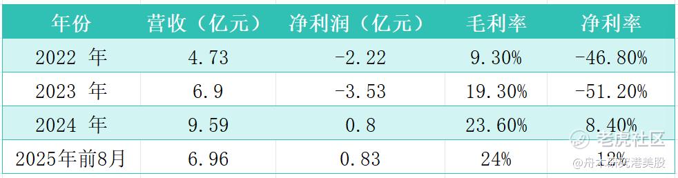 财务层面,公司已实现盈利突破。2022-2024年营收从4.73亿元增至9.59亿元,复合年增长率达42.3%。2022-2024年净利润分别为-2.15亿元、-3.51亿元、8380.50万元,2024年同比增幅达123.90%,正式告别连续亏损状态。2025年前八个月,收入达6.96亿元,净利润8321万元,真正从投入期进入了盈利期。