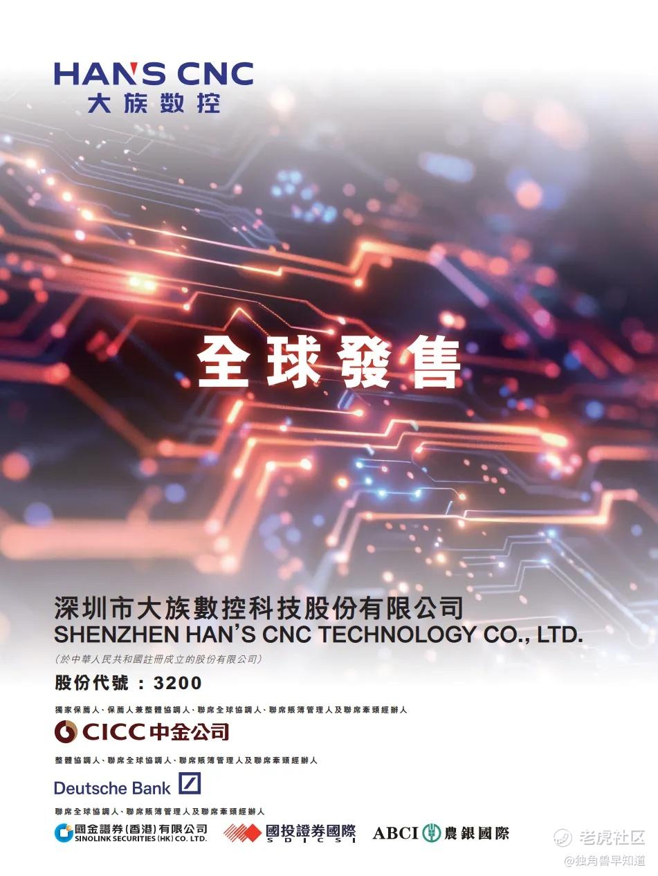 大族数控(03200.HK)发布公告,公司拟全球发售5045.18万H股,中国香港发售股份504.52万股,国际发售股份4540.66万股(以上可予重新分配及视乎超额配股权行使与否而定);2026年1月29日至2月3日招股,预期定价日为2月4日;发售价将不超过每股发售股份95.80港元,H股的每手买卖单位将为100股,中金公司为独家保荐人;预期H股将于2026年2月6日开始于联交所买卖。 $大族数控(03200)$ $大族数控(301200)$