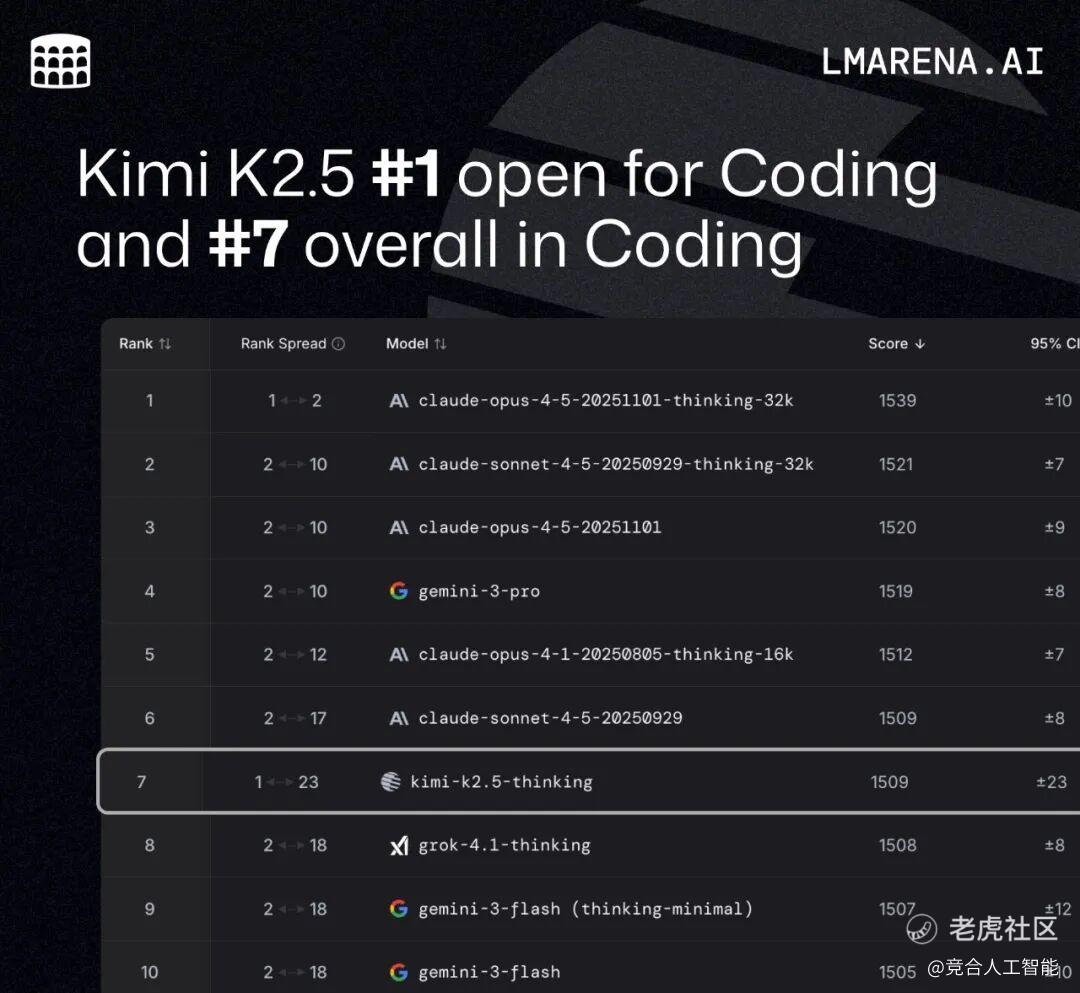 在权威榜单LMarena的最新排名中,Kimi K2.5在代码、文本等榜单中仅次于Claude 4.5与Gemini 3 Pro等顶级闭源模型,在全球开源模型中位居首位。