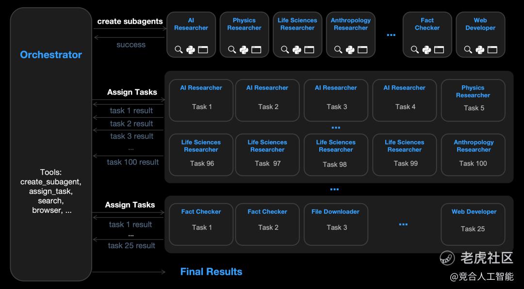 Swarm基于并行强化学习(PARL),能够将一个宏观的复杂任务瞬间拆解,并生成多达 100 个子智能体并行工作。这种架构上的变迁,好比从单核 CPU 的串行计算时代,跨越到了 GPU 的并行计算时代。