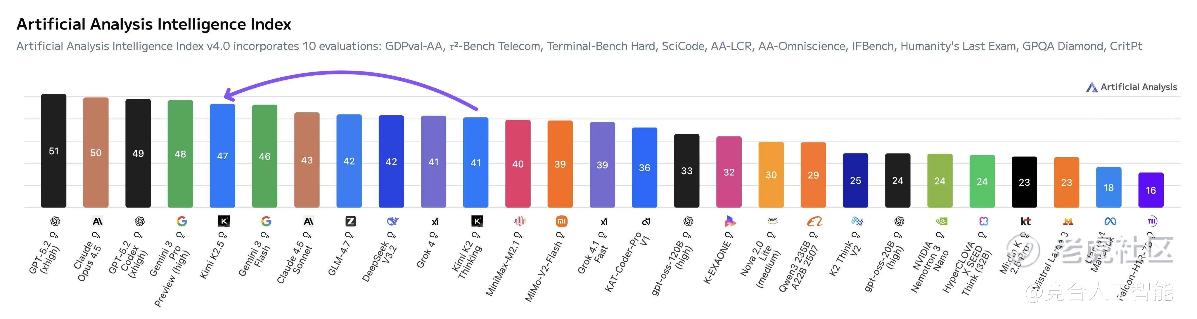 同样地,在著名独立评测机构Artificial Analysis的榜单中,Kimi K2.5也在所有开源模型中排名第一。
