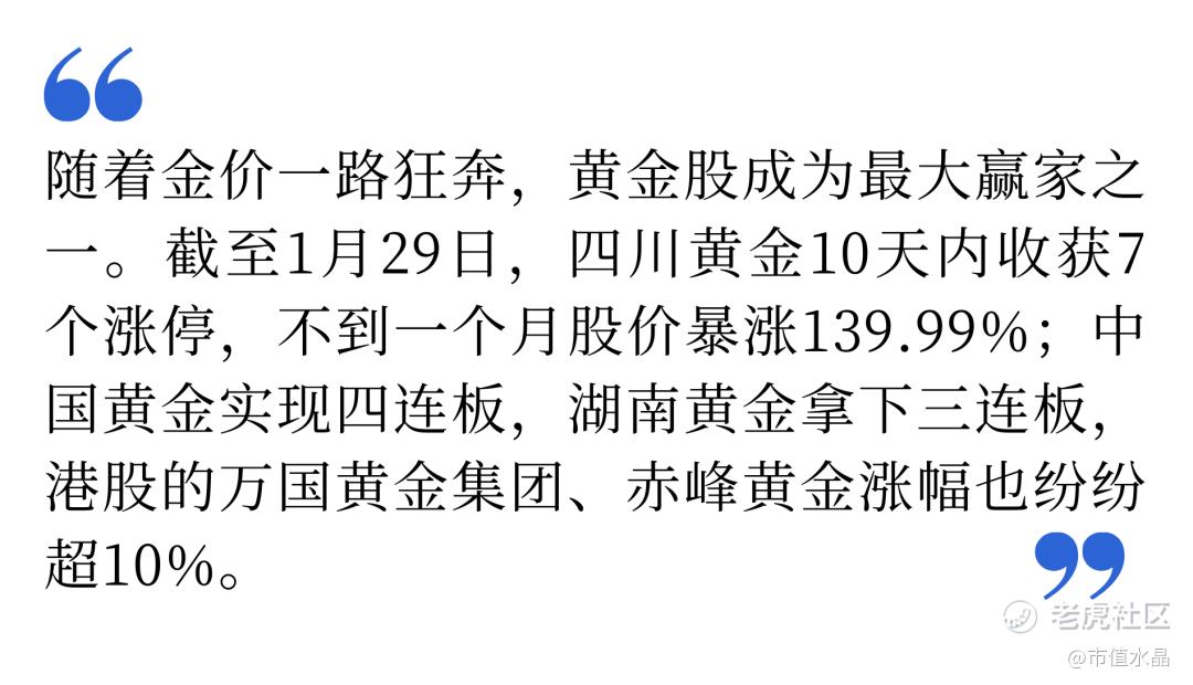 随着金价一路狂奔,黄金股成为最大赢家之一。截至1月29日,四川黄金10天内收获7个涨停,不到一个月股价暴涨139.99%;中国黄金实现四连板,湖南黄金拿下三连板,港股的万国黄金集团、赤峰黄金涨幅也纷纷超10%。与此同时,已披露2025年业绩预告的黄金股清一色预喜,净利润涨幅最高可达90%。