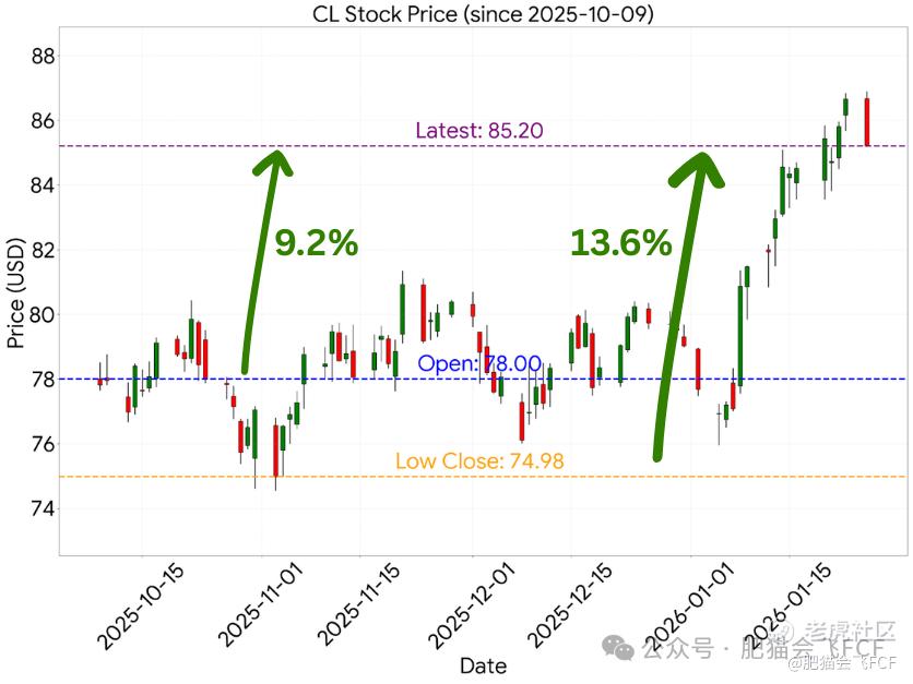 有朋友在评论区说 CL $高露洁(CL)$ 和 CMG $墨式烧烤(CMG)$ 依然是“一潭死水”。如今四个月过去,它们应该算不上“死水”了吧?CMG的走势,我们在《GGB三个月反弹70%:一次对“隐藏资产型价值投资”的完整验证》中已经详聊过;今天,我们再来对一下 CL 的作业。