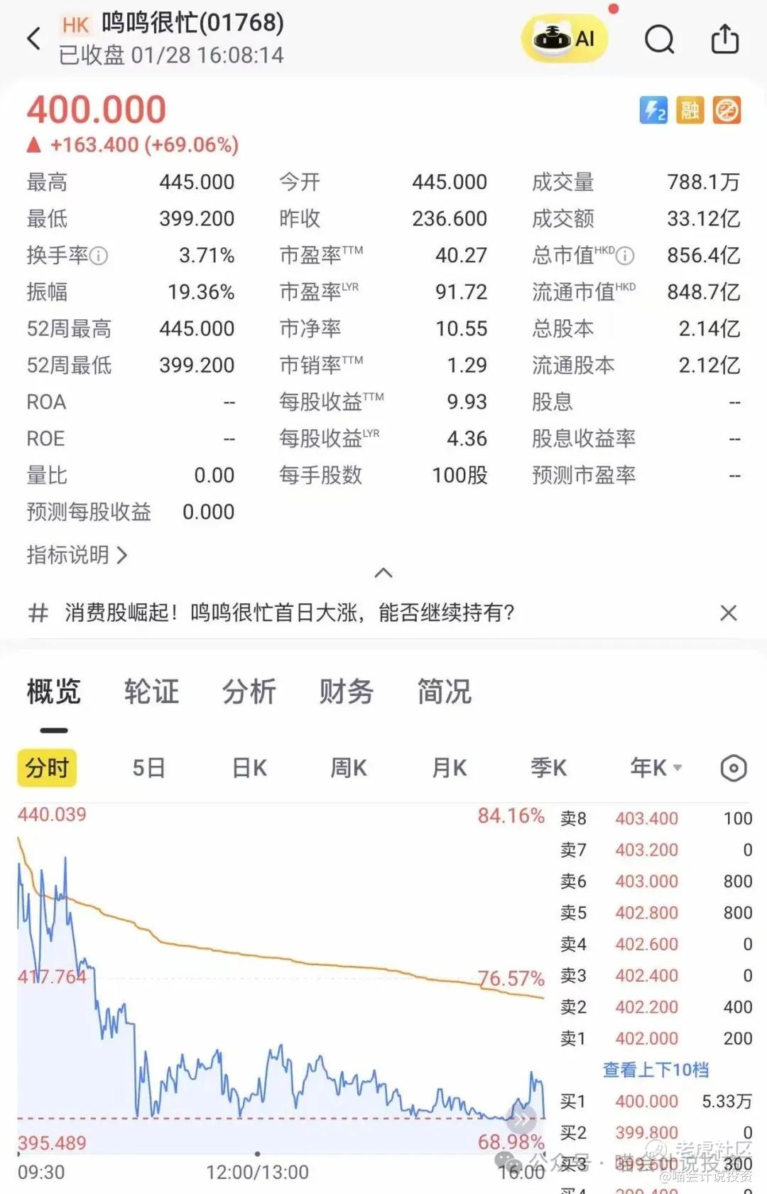 今天IPO首日交易,重复暗盘先高后低的剧本,收盘正好收在400港元。