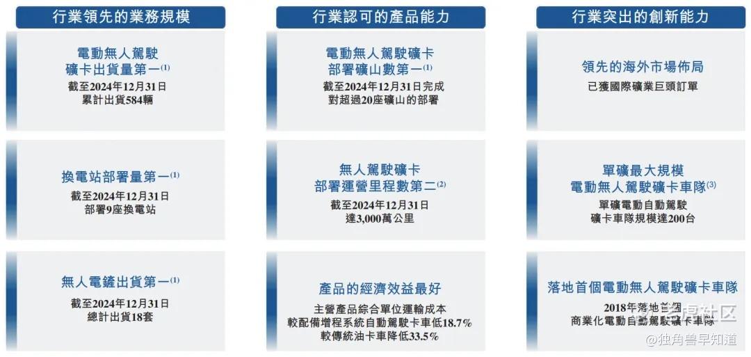 凭借与整车厂商在智能矿车正向设计领域的合作,公司为矿山服务企业、矿主及矿卡原始设备制造商等客户提供伯镭纯电自动驾驶矿卡及解决方案。根据灼识咨询的资料,在自动驾驶矿卡解决方案提供商中,公司是业内唯一拥有自主生产设施的供应商,同时也是充换电一体矿卡的独家提供商。公司率先实现自动驾驶矿卡的量产,公司的旗舰车型也已实现量产。