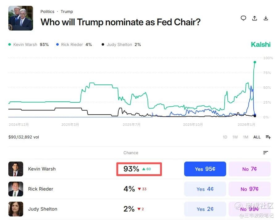 在博彩网站上,沃什成为下一任美联储主席概率飙升到了93%。