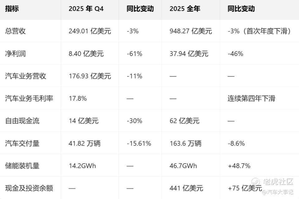 2026年初,特斯拉公布2025年财报,创下上市以来多项“最差纪录”:全年营收948.27亿美元(同比下滑3%),史上首次收缩;净利润37.94亿美元,较上年锐减46%近乎腰斩。