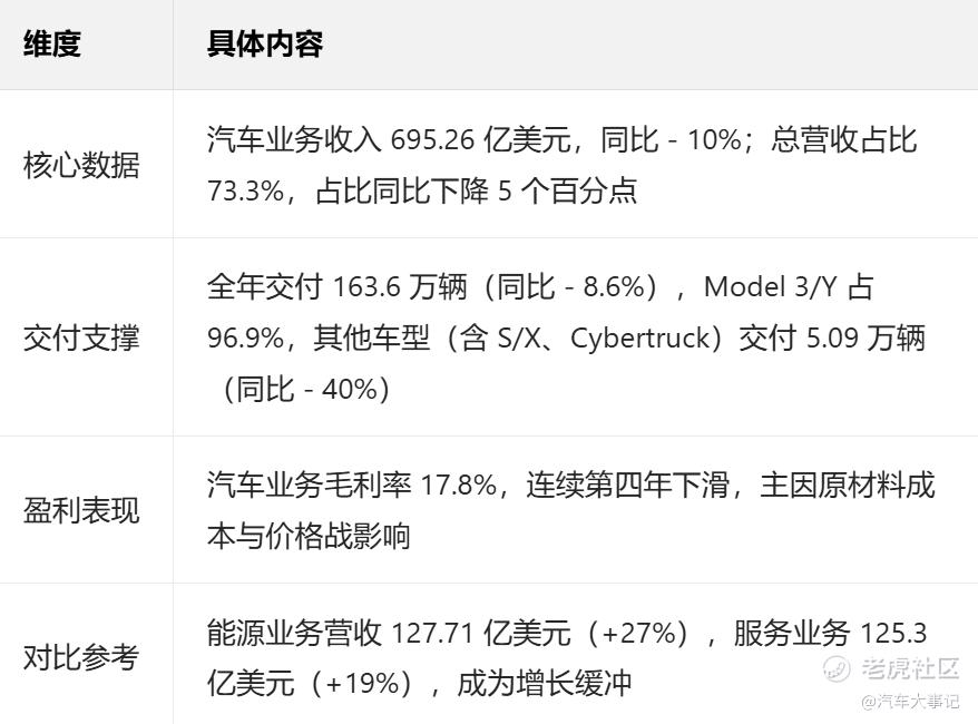 汽车销量与营收的双重下滑,是特斯拉2025年业绩困境的核心原因,直接动摇了公司的业务基本盘。长期以来,汽车业务始终是特斯拉营收和利润的主要贡献来源,占比常年维持在70%以上,而2025年这一核心板块的表现却陷入低迷。