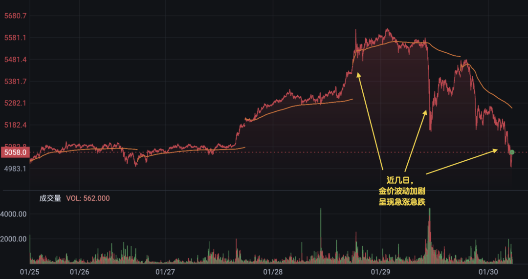 国际金价昨天冲高5600美元/盎司后,今天傍晚跌破5000。