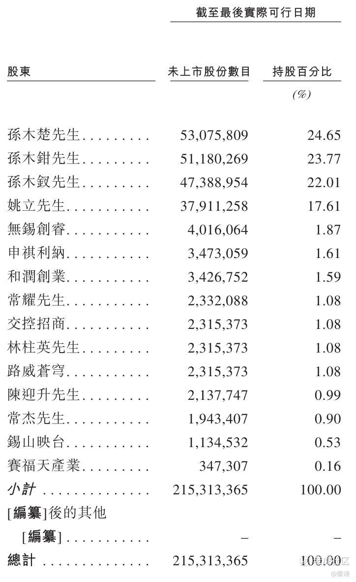 IPO前,孙木钳、姚立、孙木楚直接及透过无锡创睿(作为其唯一的普通合伙人),及孙木钗可透过共同控制安排以及彼等在管理业务方面的长期合作行使公司合计89.91%投票权。