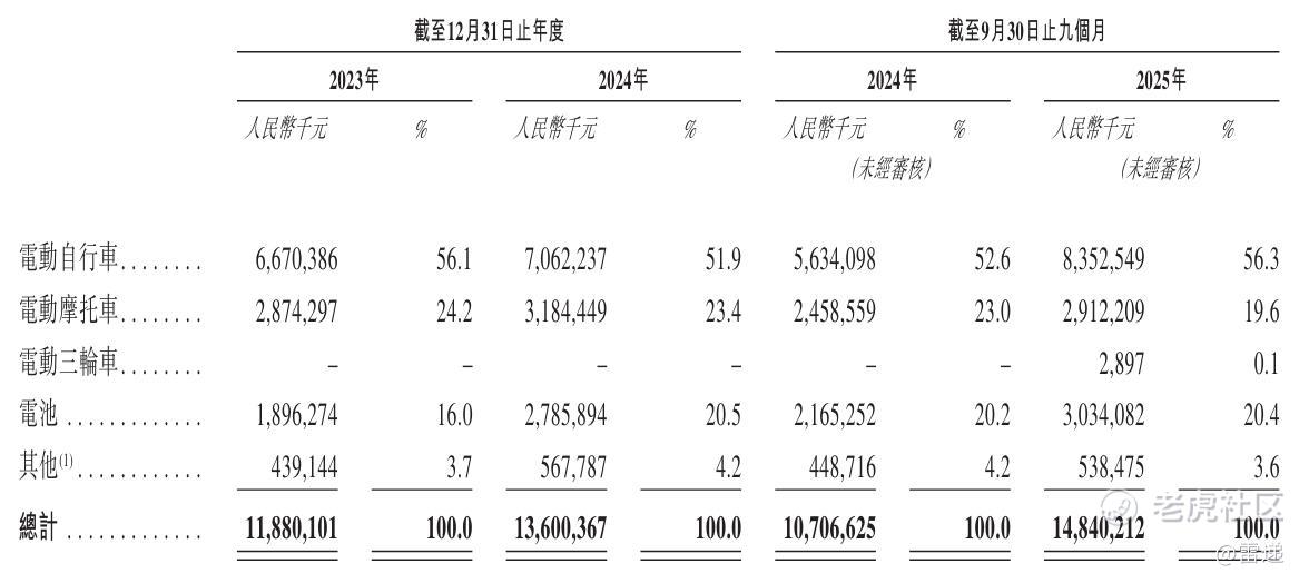 台铃科技2025年前9个月来自电动自行车收入为83.53亿元,占比为56.3%;来自电动摩托车收入为29.12亿元,占比为19.6%;来自电池收入为30.34亿元,占比为20.4%。