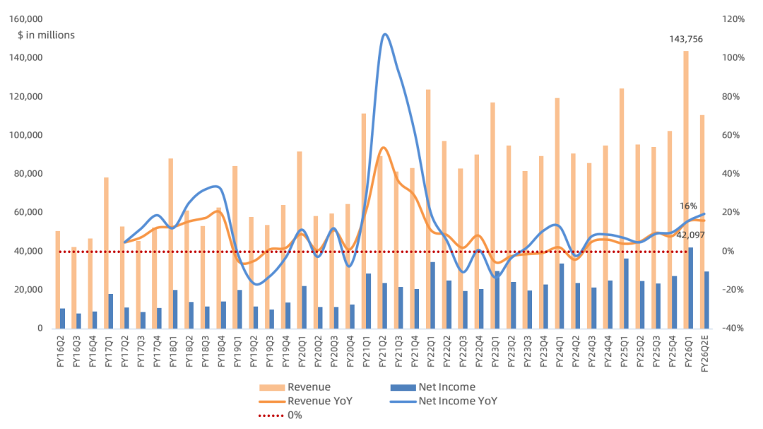 预计FY26Q2营收同比增长13%-16%,iPhone产能受限,Services同比增速与本财季一致(14%),毛利率48%-49%,经营费用184-187亿美元,这样算下来Q2净利润上限同比增长20%(约296亿美元),增速将创FY22Q1以来新高;