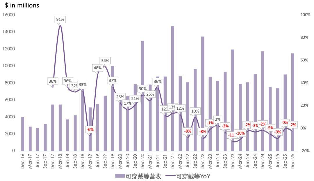 可穿戴等营收115亿美元,同比下滑2%,连续10个季度同比下滑,低于市场一致预期的121亿美元;AirPods Pro 3产能受限,否则该整体品类本会实现增长;