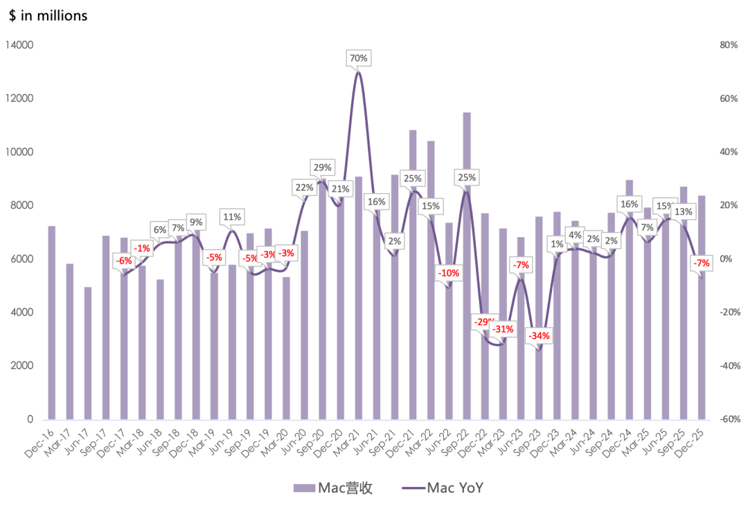 iPhone营收853亿美元,同比增长23%,增速创下自2021年以来新高,高于市场一致预期的782亿美元;iPhone营收在美国、大中华区、拉丁美洲、西欧、中东、澳大利亚与南亚创下历史新高,在印度创下同期新高,连管理层都惊叹于iPhone需求之旺盛;iPhone活跃装机基数增长至新高;