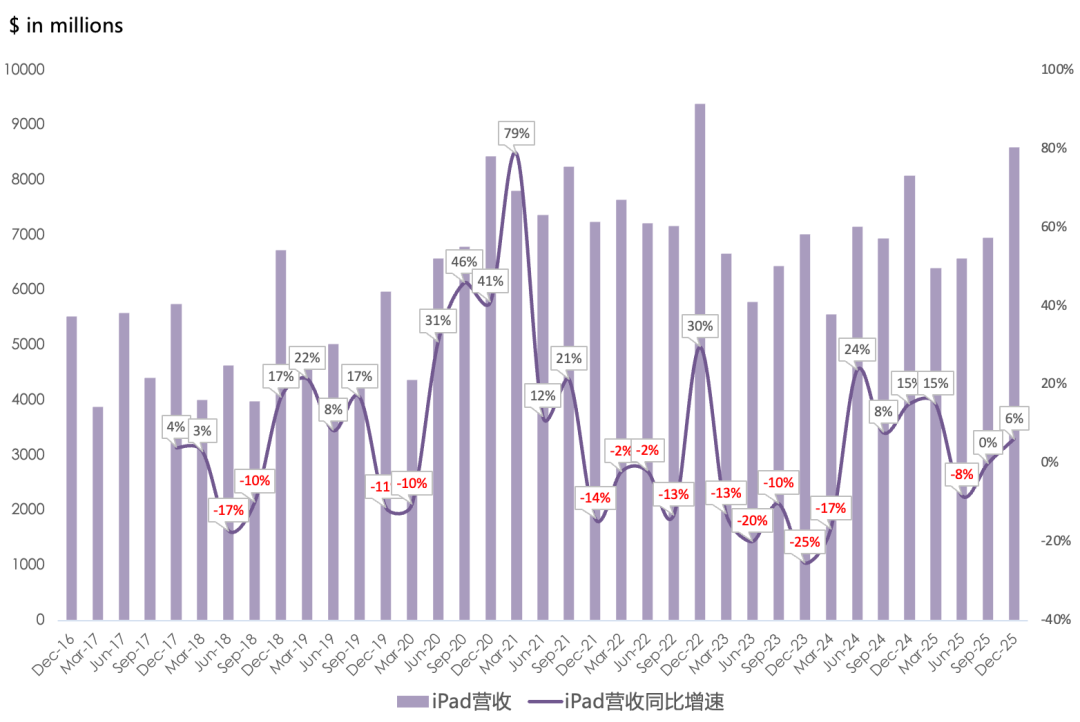 Mac营收84亿美元,同比下滑7%,低于市场一致预期的91亿美元;Mac安装基数创新高,购买Mac的客户中有近一半是该产品的新用户;在巴西、印度、马来西亚、越南等新兴市场实现增长;iPad营收86亿美元,同比增长6%,高于市场一致预期的82亿美元;iPad安装基数创新高,换机用户也创新高;