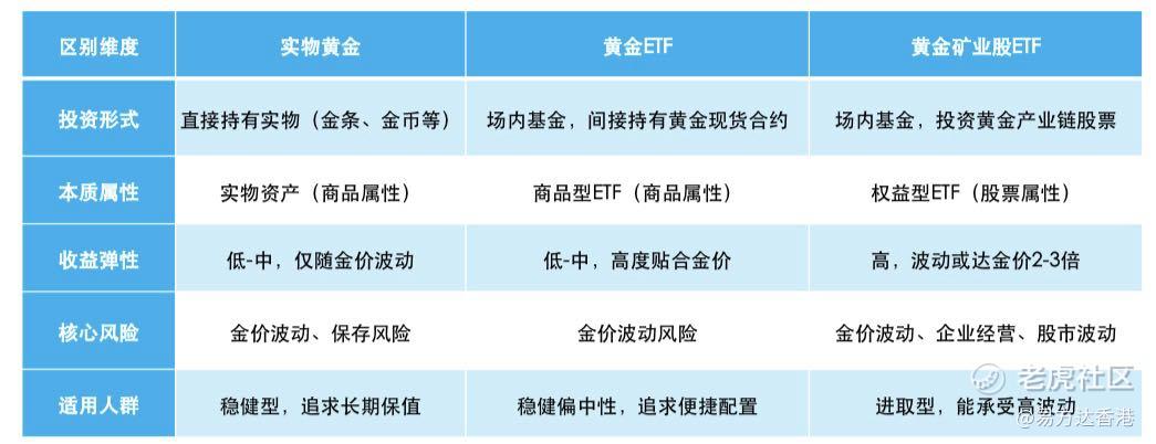 总结:实物黄金重保值、黄金ETF重便捷、黄金矿业股ETF重收益弹性。投资者需明确自身投资目标和风险承受力,避免将三者混淆,才能实现理性配置。