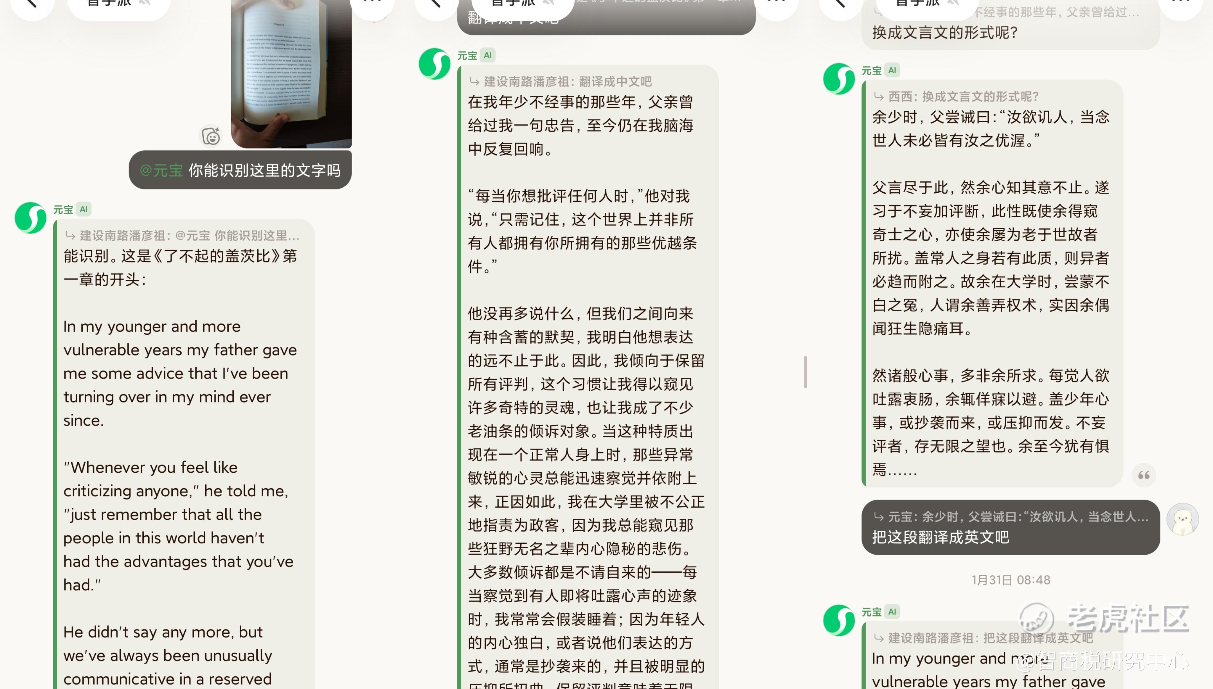 同时,流水线上的第三位成员,继续找元宝来帮帮场子,将汉语内容转化成文言文,再之后校对、排版一条龙,厚厚的一本英文小说,就有了汉语古文的画风。