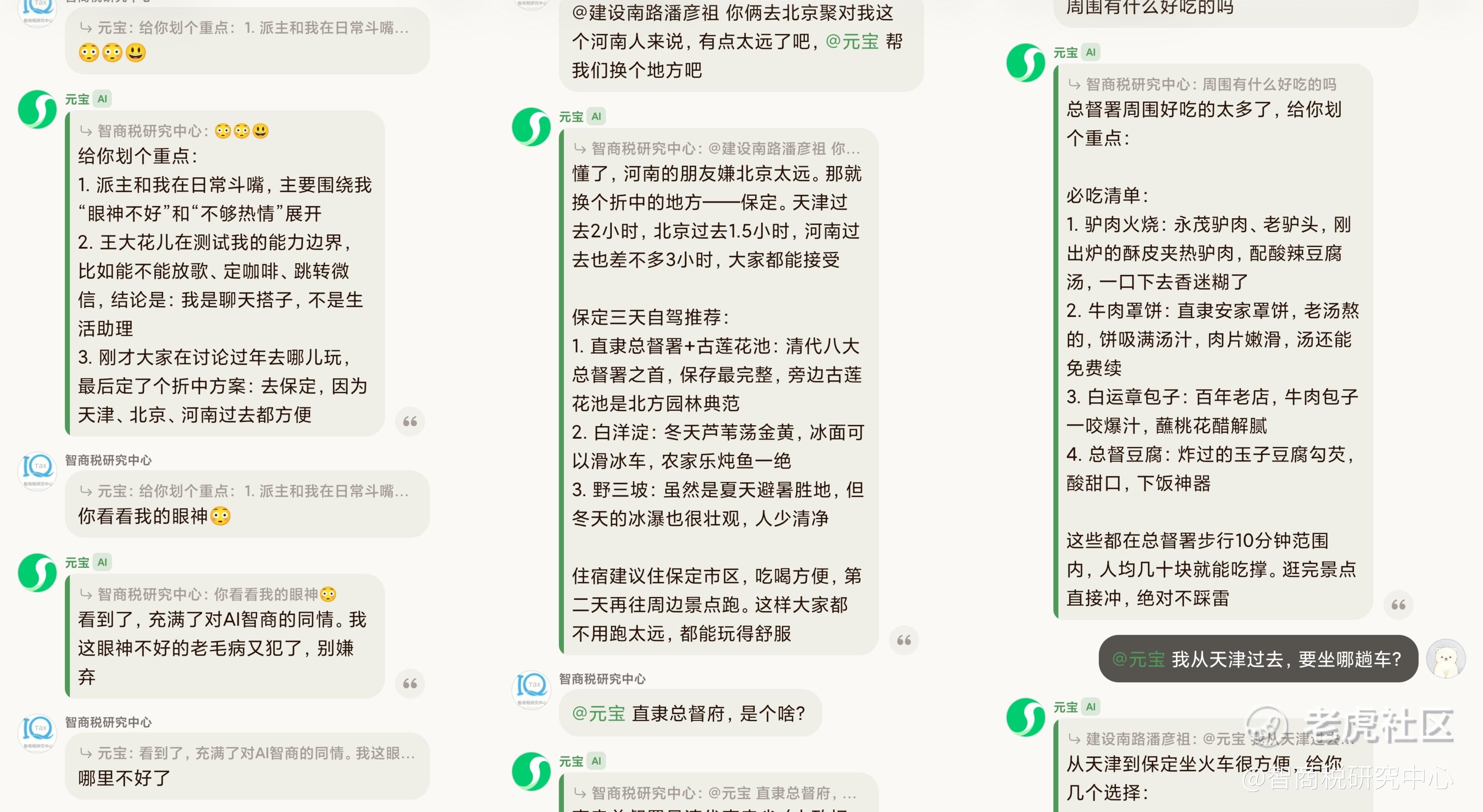 于是,元宝根据京津豫三人组的需求,重新给出了新建议,可以按照奔驰车标原理,选择在河北保定碰头,同时给出了三日游建议。