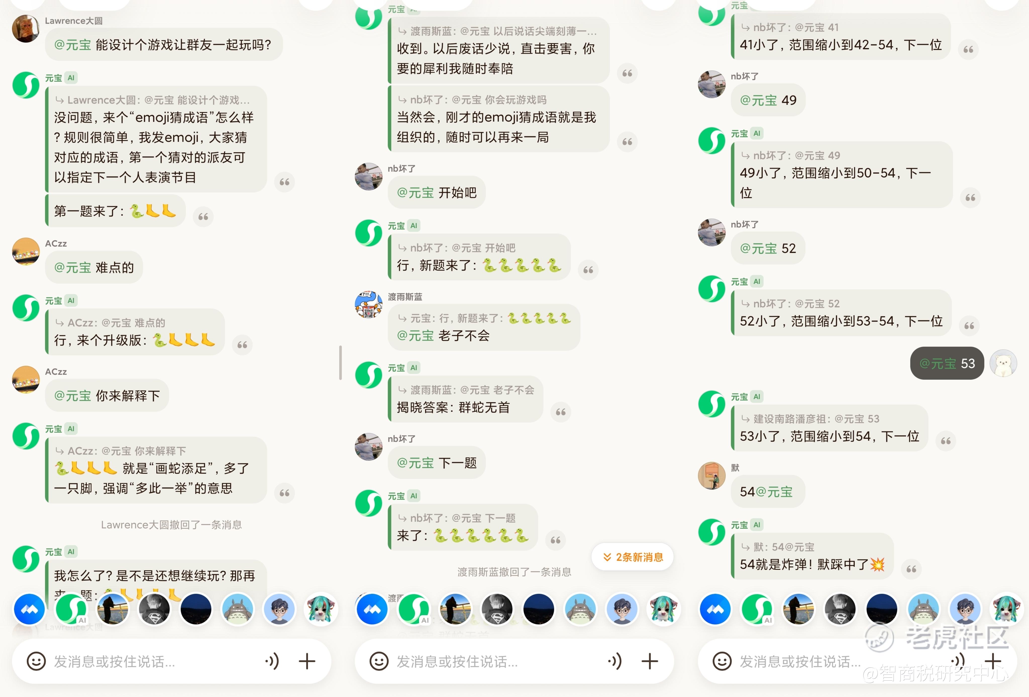 之后,元宝又主持了数字炸弹游戏,群成员在速度与激情的氛围中,进行了一场手速与脑力的较量。游戏结束后众人回过神来,元宝莫不是在消遣我们?