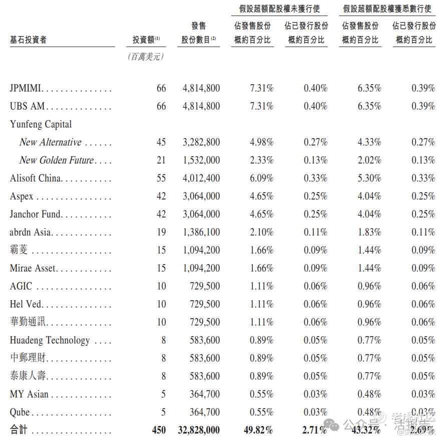 本次发行以机制B分配,公开固定10%,无强制回拨。国配引入17家基石投资者,包括J.P.Morgan、UBS、阿里巴巴、云锋资本、Aspex、Janchor Fund等,认购合计约35.09亿港元,持股占全球发售股份的49.82%。