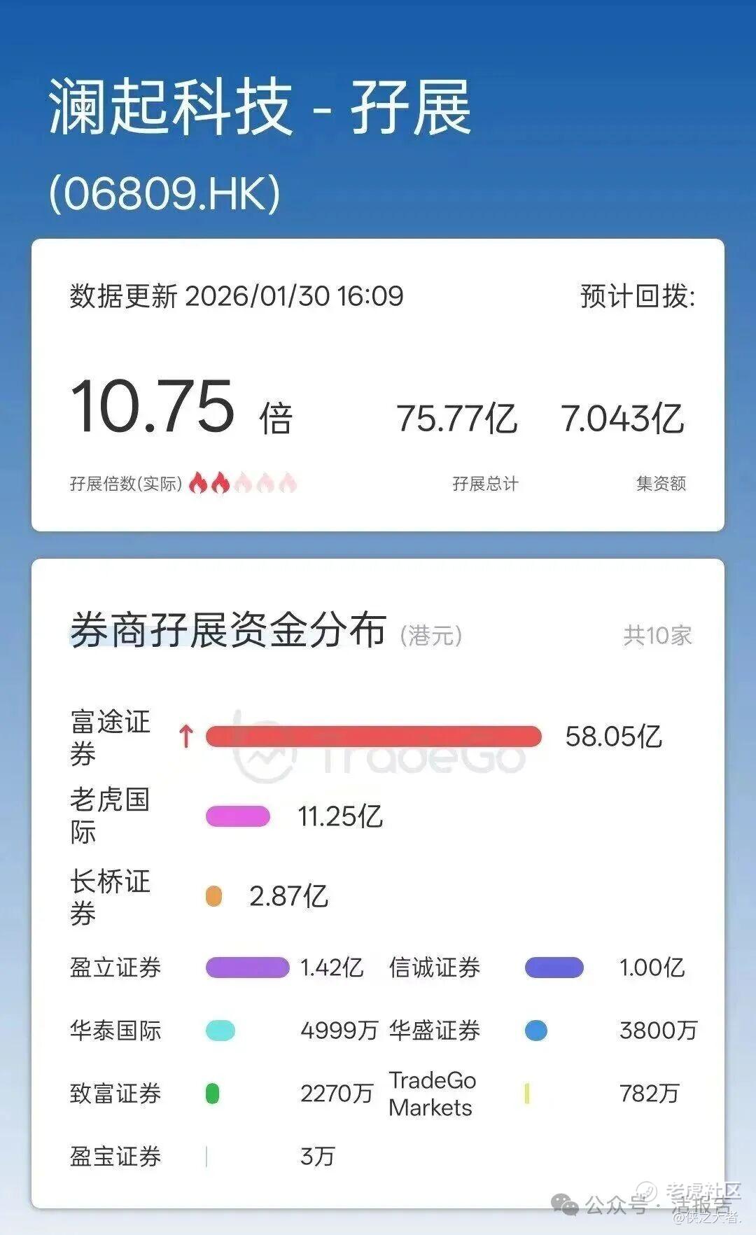 据TradeGo新股孖展数据,截至1月30日16时,澜起科技的孖展认购总额已达75.77亿港元,孖展认购倍数约10.75倍。其中,富途证券、老虎国际、**证券分别放出58.05亿、11.25亿、2.87亿港元的孖展。