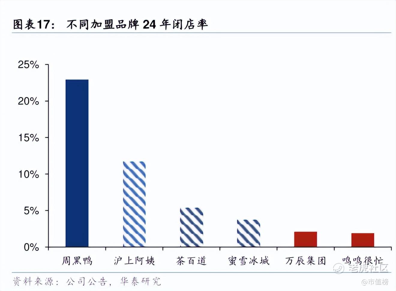根据华泰证券的研报,以2024年为例,量贩零食品牌的闭店率要远低于奶茶、卤味等加盟品牌。2024年也是鸣鸣很忙高速拓店、两个品牌(零食很忙和赵一鸣零食)内部整合的关键时间,鸣鸣很忙的闭店率还不到2%。