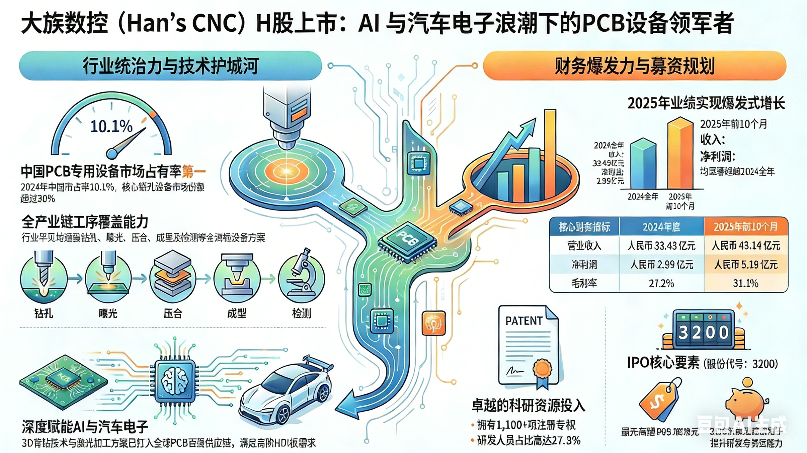 这一轮里面,最像“正常制造业IPO”的只有大族数控。PCB设备龙头,2024年收入口径市占率10.1%,直接干到行业第一,而且是全工序覆盖:钻孔、曝光、压合、成型、检测一条龙,国内能做到这一点的厂商非常少。2024年补齐PCB压合设备,其实是个关键信号——意味着它已经不只是“某几道工序强”,而是奔着平台型设备商去了。
